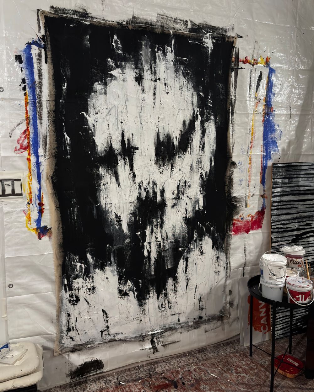 Louis's second studio was in a shared artist space that rents small units, but he stayed there for only about a month. He then moved to a larger apartment, where he set up his third studio in the living room. In this picture, there is the finalized 'Despair' painting.